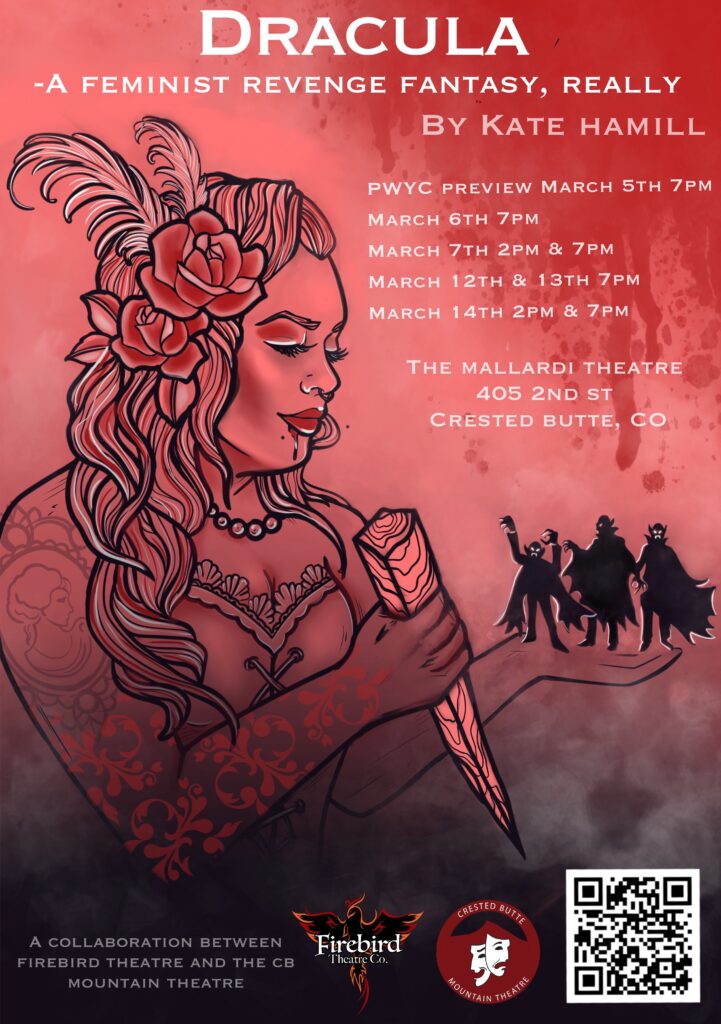 When your survival is at stake… will you be able to distinguish the monster from the man? Crested Butte Mountain Theatre and Firebird Theatre are proud to start the 2026 season with Dracula – A Feminist Revenge Fantasy, Really. Both terrifying and riotous, Kate Hamill’s imaginative, gender bending “feminist revenge fantasy” is like no Dracula you’ve ever seen, exploring the nature of predators and reinventing the story as a smart, disquieting, and darkly comic drama. Hamill’s signature style and postmodern wit upends this familiar tale of Victorian vampires, driving a stake through the heart of toxic masculinity.
